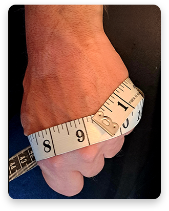 Wrap a measuring tape around the widest part of your dominant hand, just below the knuckle and excluding your thumb