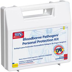 Guards caregivers of ill or injured patients and protects during biohazard clean-up. This 25 piece bloodborne pathogen kit is intended for businesses, offices and work sites that require this level of protection. Meets federal OSHA regulations. Sturdy plastic case is easily portable or wall-mountable.