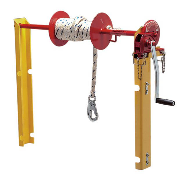 Raising and lowering equipment into confined space can be impossible without this durable winch. Even with a 300 lb. capacity, it is lightweight and portable, allowing easy mounting on guard rails. The side pieces are constructed of high tensile, heavy gauge aluminum with a durable yellow finish that resists weather and wear. The winch bar is constructed of rugged high tensile steel tubing with a 3"" drum for fast recovery. Two independent ratchet systems, and a double-disc automatic brake offer load control and security. The 1/2"" x 35' Dura-Plex braided rope is strong and durable. Guard rail not included. WARNING: Not for use as a personal retrieval device.