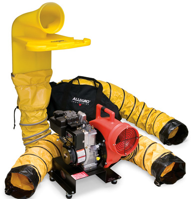 Allegro helps to make your confined space jobs easier with equipment built to the highest standards. Features durable ABS housing, metal safeguards, and steel fan 3 1/2 HP gasoline engine with sturdy metal base System includes: blower, 6' and 15' of ducting with storage bag and Manhole vintilation Passthru. Free Air: 2000-3000 CFM One 90 degree Bend: 1500-2500 CFM Two 90 degree Bends: 1350-2350 CFM. Allegro's Complete Ventilation Systems include all the most-asked-for equipment for your confined space site. The systems include a choice of Allegros most popular blowers, six feet and fifteen feet of ducting with a storage bag and Manhole Ventilation Passthru. The Centrifugal Blower Systems offer lightweight portability with the highest output available.