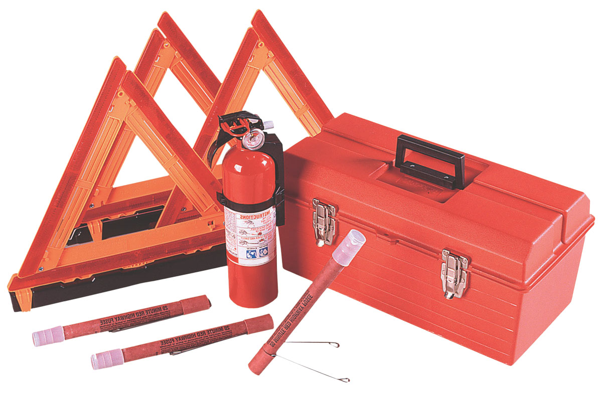 • Kit includes: (3) Triangles, (1) 2.5 lb. Fire Extinguisher, (3) 20mm fuses in a Metal Case