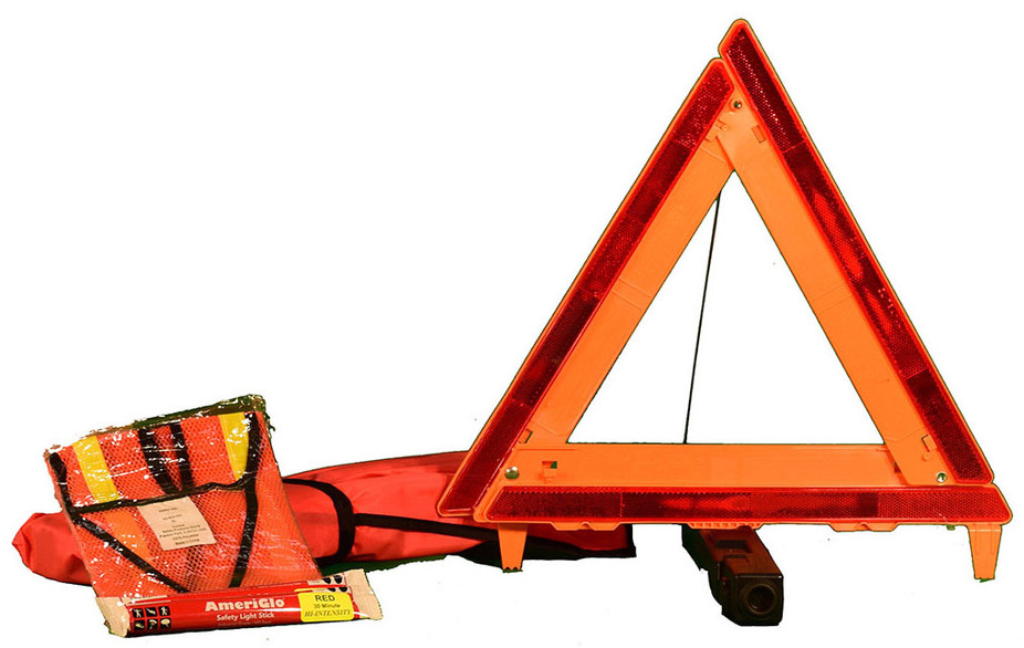 • Includes 1 Triangle, 2 30-Minute Lightsticks, 1 Orange Safety Vest in a Silk Storage Bag