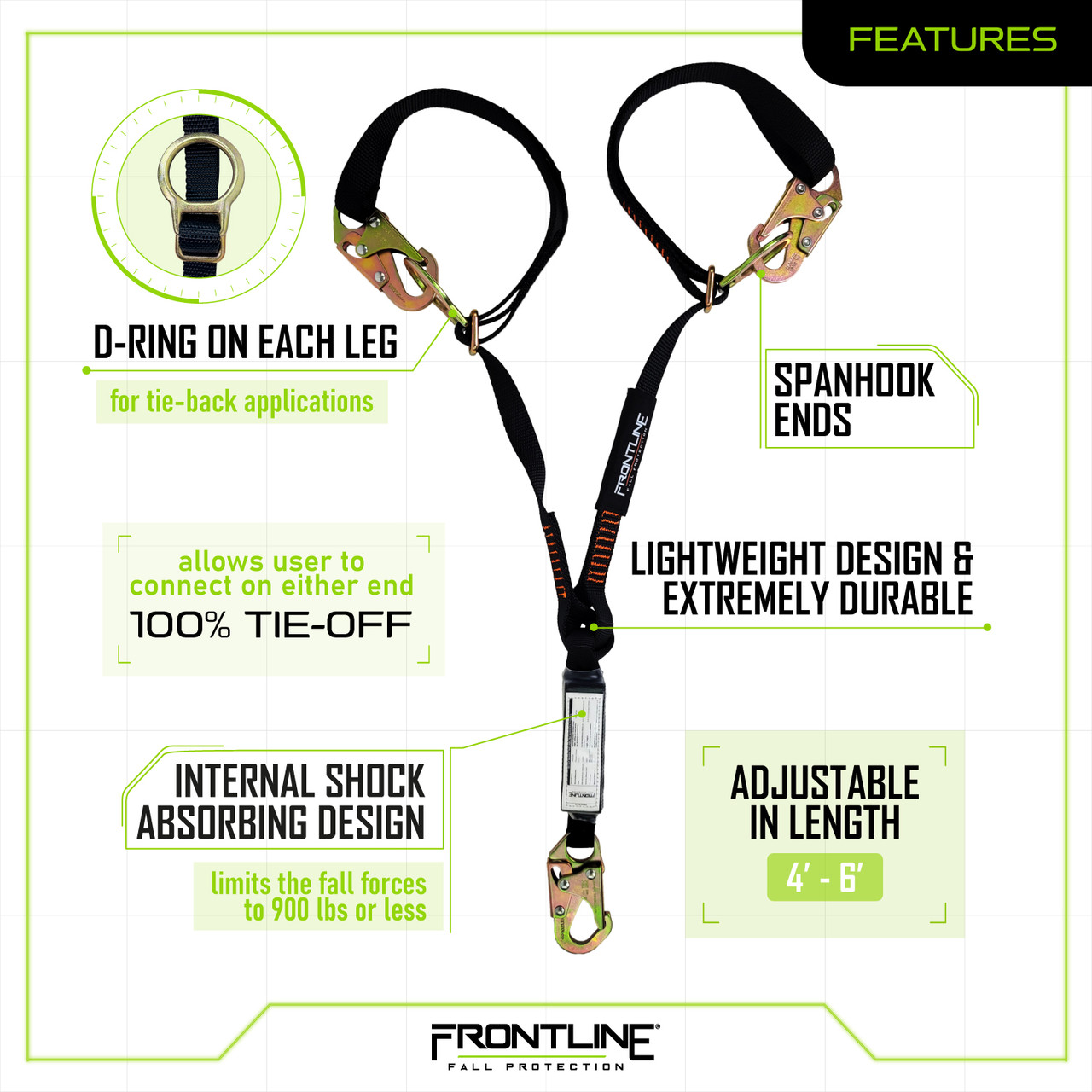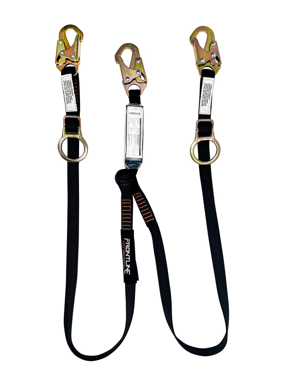 Frontline Combat™ 6' Tie-Back Double Leg Shock Absorbing Lanyard, Snaphooks, Meets ANSI & OSHA