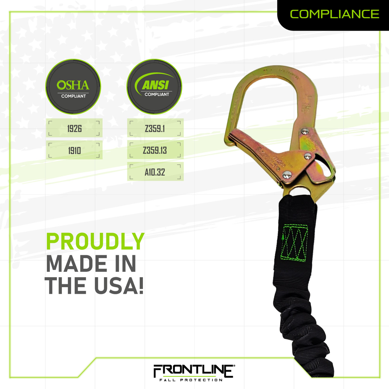 Experience superior craftsmanship, precision manufacturing and demonstrated dependability with Frontline Patriot™ lanyards, as these American-made Shock Absorbing Lanyards consistently surpass industry standards and user expectations!