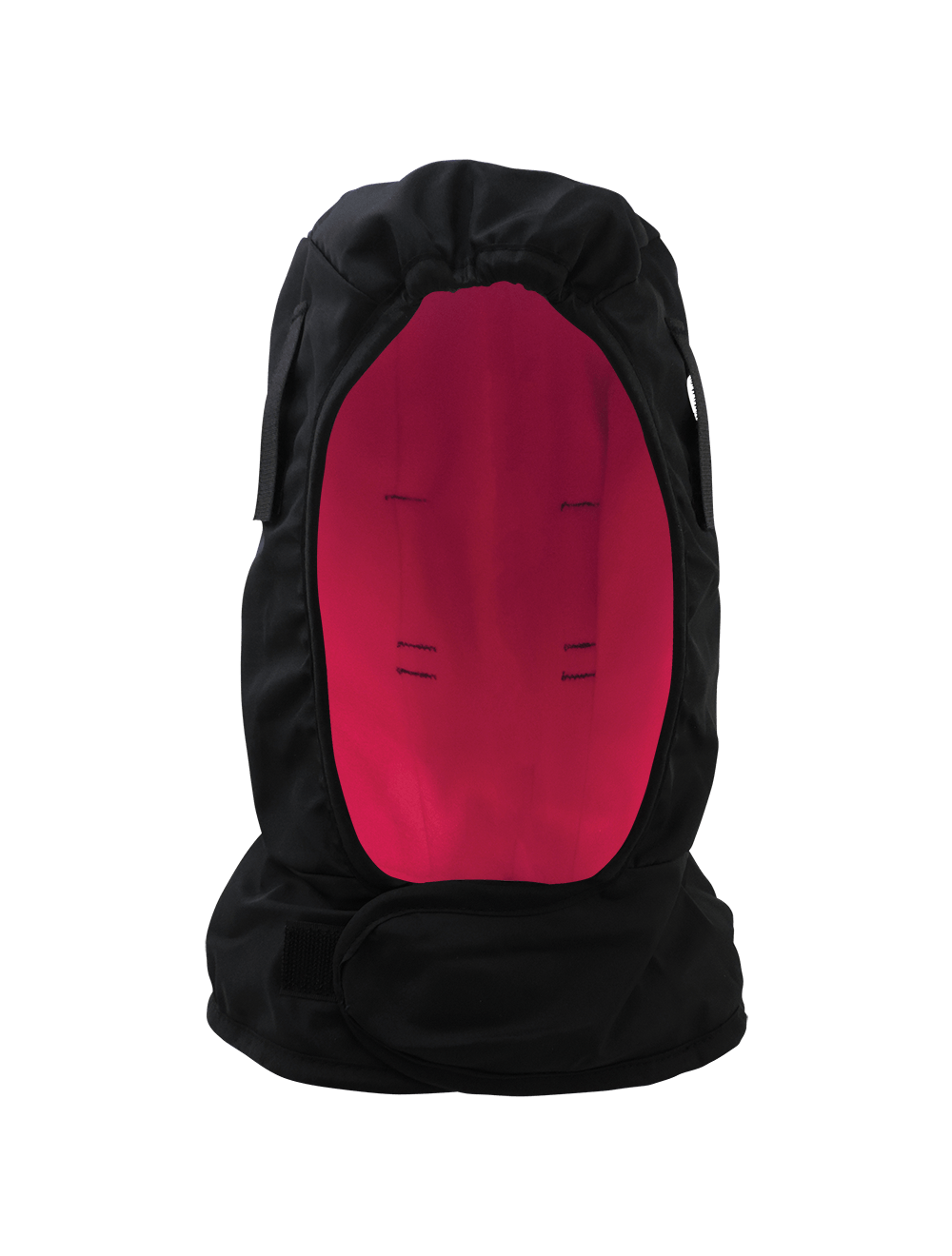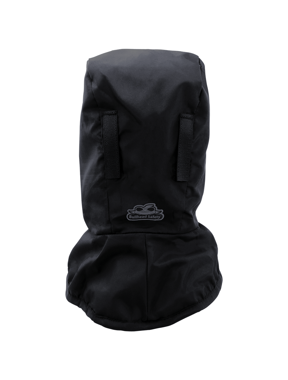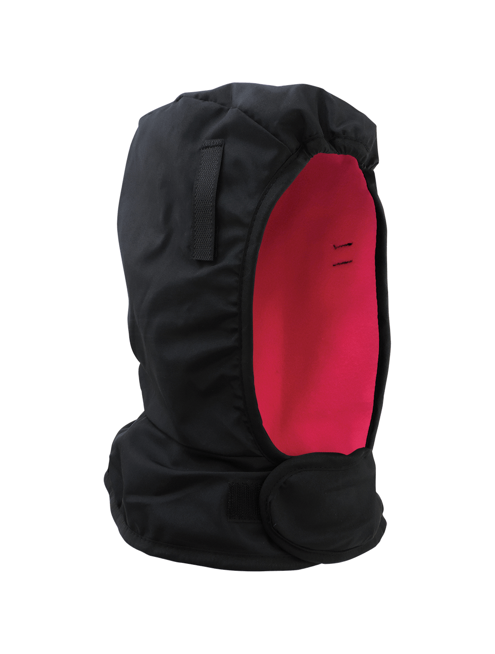 This black economy thermal winter liner is shoulder length with a two-layer polyester shell and a soft red fleece lining. It features a hook-and-loop chin strap and hard hat attachment as well as a silver reflective accent logo. One size fits all.