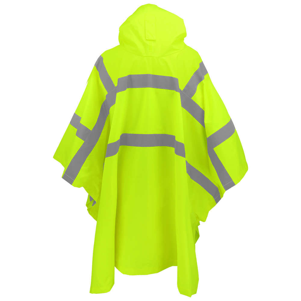 This ANSI Class 3 rain poncho is constructed with high-visibility yellow/green 0.18 mm PVC-coated 170T polyester and features silver reflective material for additional visibility in dark conditions. The attached drawstring hood has a flexible wire brim, and the front features one chest pocket and plastic button snaps on the sides. This rain poncho is 55 x 80 inches when unfolded and laid flat.