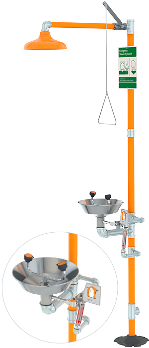 • Application: Combination eyewash and shower safety station. Unit is furnished with a temperature-actuated scald protection valve. When water temperature rises above 95°F, valve automatically opens to allow water to circulate through unit, preventing injury to user. Unit is designed so that, when drain valve is open, there are no “dead legs” of water standing in unit. Water flow stops when temperature falls below 95°F.