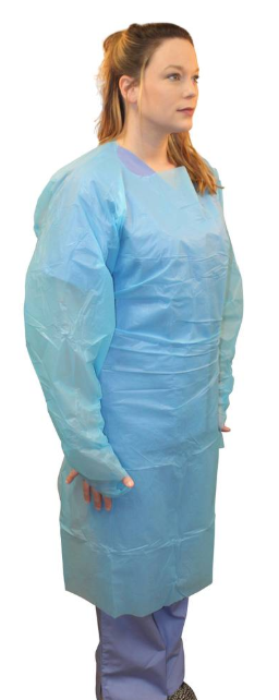 Malt Blue Polyethylene Isolation Gown with Thumb Loops, 50", Universal Size, 100/Case - CLOSEOUT!