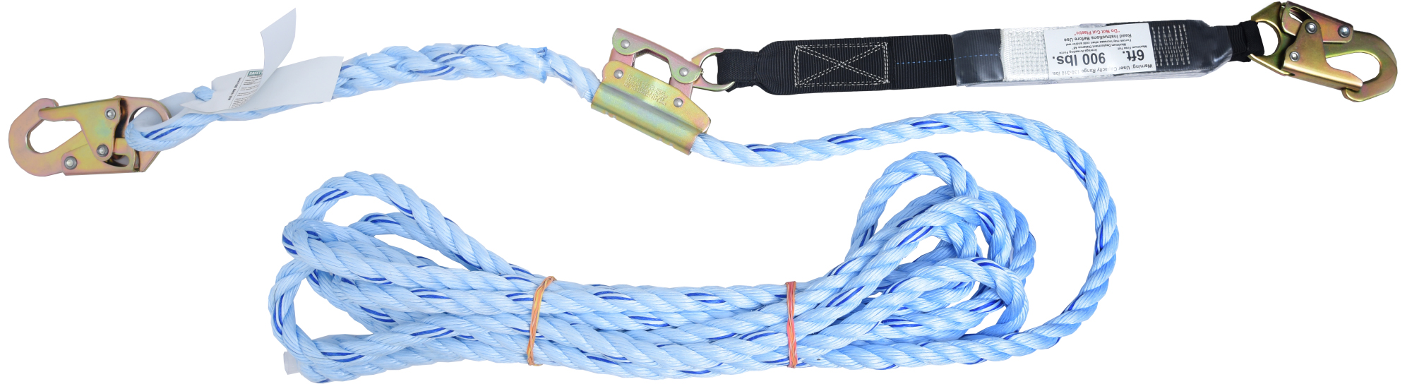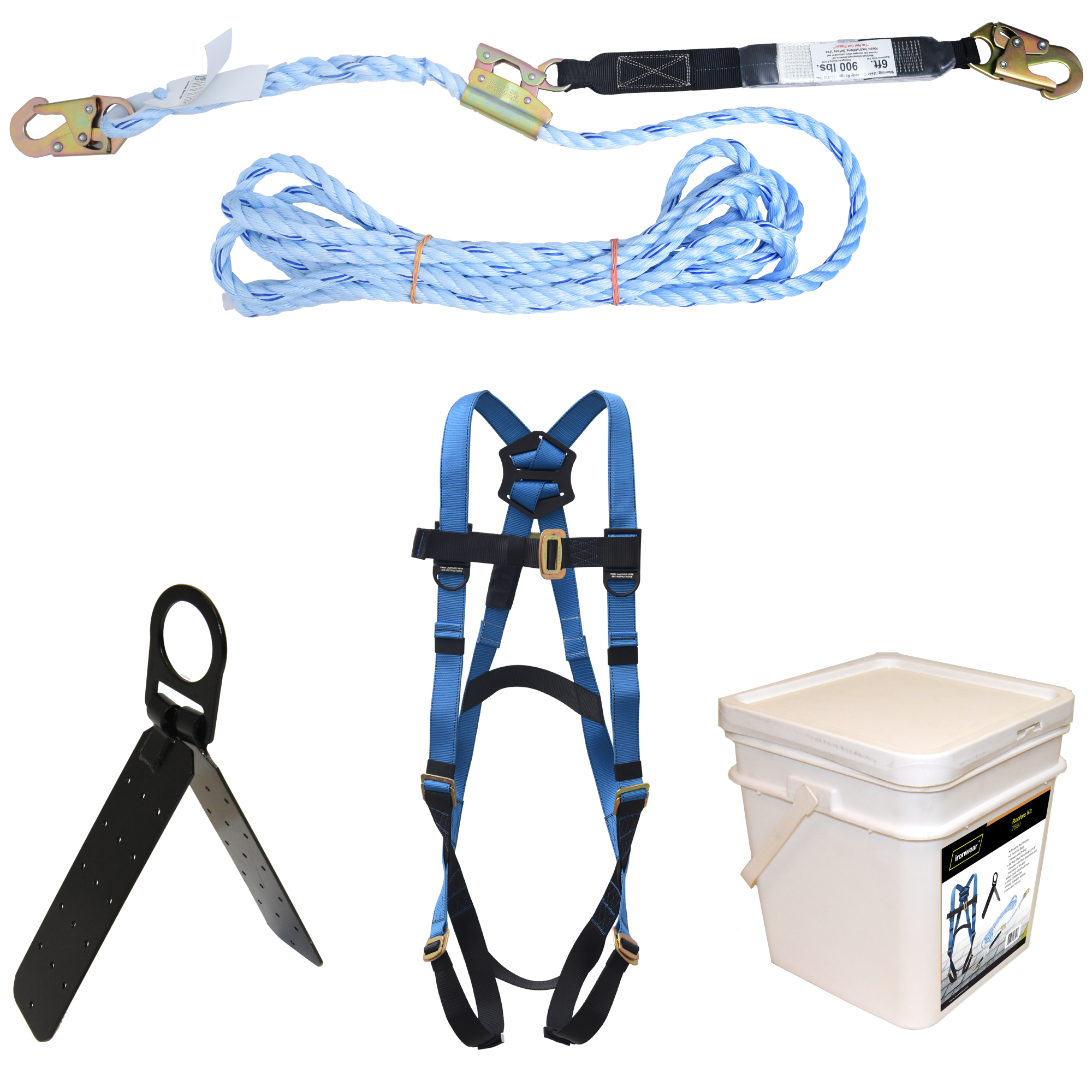 The Ironwear Roofer's kit features a storage bucket, a reusable roof anchor, a 5 point full body harness with D-Ring, a 50ft poly-steel rope with a 5/8" diameter, steel snap hook and stop knot at the end, and a rope grab with shock pack.