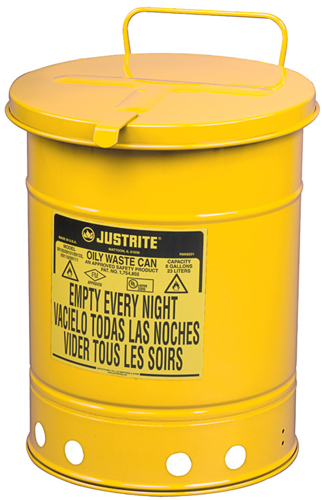 Rags and cloths soaked with solvents, thinners, linseed oil, combustible adhesives and other flammable liquids present a serious fire risk when improperly discarded. Lid opens to no more than 60 degrees and stays closed when not in use, isolating contents from fire sources and limiting oxygen to virtually eliminate the risk of spontaneous combustion. Round construction and elevated base allow circulation of air around can to disperse heat and reduce moisture build-up and rusting. Durable steel construction with a powder-coat finish provides chemical resistance. Ten-year warranty.