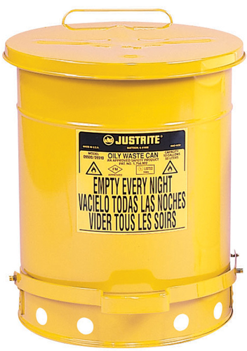 Justrite 09501 Yellow Oily Waste Can - Foot Operated, Self Closing Cover, 14 Gallon