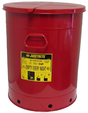 Rags and cloths soaked with solvents, thinners, linseed oil, combustible adhesives and other flammable liquids present a serious fire risk when improperly discarded. Lid opens to no more than 60 degrees and stays closed when not in use, isolating contents from fire sources and limiting oxygen to virtually eliminate the risk of spontaneous combustion. Round construction and elevated base allow circulation of air around can to disperse heat and reduce moisture build-up and rusting. Durable steel construction with a powder-coat finish provides chemical resistance. Ten-year warranty.