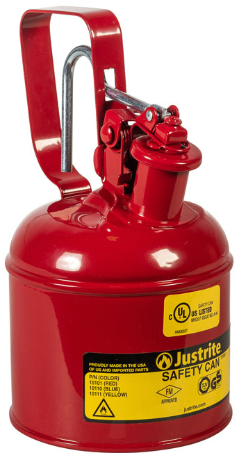 Made from high-grade coated steel, each can is tested to guarantee 100% leakproof construction. The tough powder-coat finish resists chemicals and stands up to demands of rigorous use. Each Justrite safety can is equipped with a stainless steel flame arrester which dissipates heat to stop flashback ignition. Cans up to 1 quart (1L) feature a trigger-release handle, while larger capacities have a swinging handle to greatly ease carrying of heavier loads.