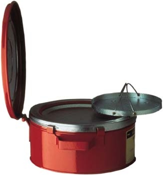 Simply place work on spring-loaded, perforated dasher plate, press down and agitate, then release to return dasher to drain position. Plated steel dasher also works as an effective flame arrester to reduce the risk of fire flashback. Hinged cover minimizes evaporation losses and protected rim reduces the possibility of hand injury. Cans are made of sturdy 24-gauge steel with tough powder-coat finish.