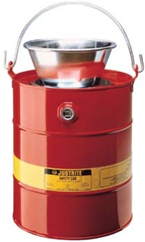 Justrite 10903 Drain Cans easily and safely collect used solvents from parts washing equipment. Wide mouth funnel catches drainage with no spill, no mess. Removable funnel is plated steel. Built-in flame arrester keeps fire from contents. A .75" threaded plug allows safe disposal of waste liquids from the drain can into a permanent receptacle.
