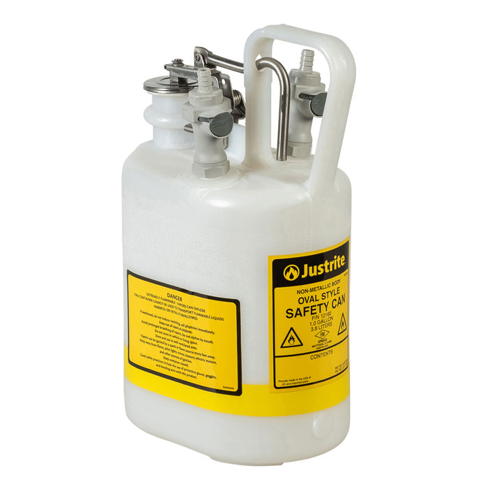 These Justrite 12160 Safety Cans are made for your safety!  The quick disconnect fittings allow liquids to flow freely through tubing . The polyethylene container is strong and durable and features openings for controlled pouring into larger disposal containers to properly dispose of wastes. Opening is equipped with a stainless steel flame arrester which dissipates heat to prevent flashback ignition. Features a latch on the handle to that keeps the lid open if needed to help in the ease of pouring.  The cans are translucent for checking liquid leves easily and efficiently.