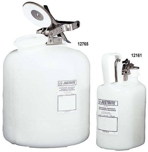 Justrite 12762 Self-Closing Containers are constructed of translucent, high density polyethylene are specifically designed to resist acids and caustics. Spring-close cap provides a tight seal. Flame arrester-free spout allows quick pouring of non-flammable corrosives. Oval containers make the most of storage capacity and are marked in liters, quarts and gallons to permit accurate filling and dispensing.