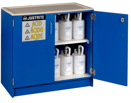 Justrite 24140 Wood Laminate Corrosives/Acids Safety Cabinet, Blue – Holds 36 x 2.5L Bottles