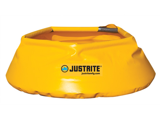 Use this space saving Justrite Pop-Up Pool  to contain spills from punctured saddle tanks, leaking drums, hydraulic lines, pipes and machinery.  The durable vinyl fabric is 20% heavier than other models on the market providing increased abrasion resistance and more reliable seam adhesions.  The yellow color provides visibility and easy identification. The embedded foam ring top raises containment wall as fluid level increases
