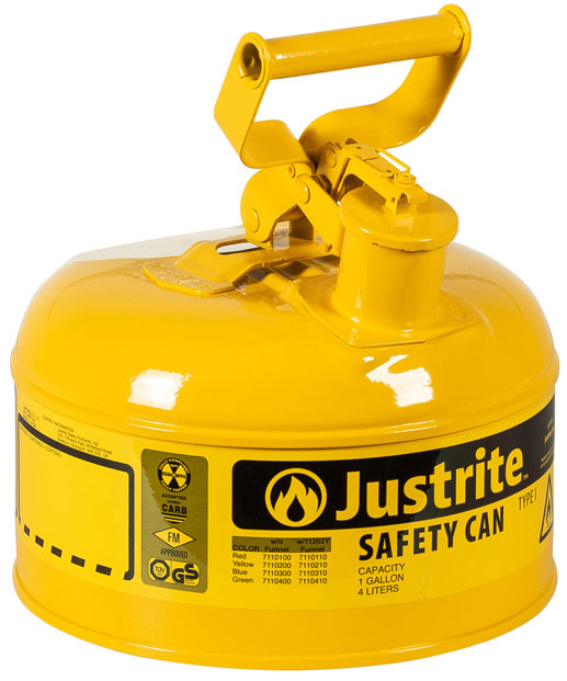 Made from high-grade coated steel, each can is tested to guarantee 100% leakproof construction. The tough powder-coat finish resists chemicals and stands up to demands of rigorous use. Each Justrite safety can is equipped with a stainless steel flame arrester which dissipates heat to stop flashback ignition. Cans up to 1 quart (1L) feature a trigger-release handle, while larger capacities have a swinging handle to greatly ease carrying of heavier loads.