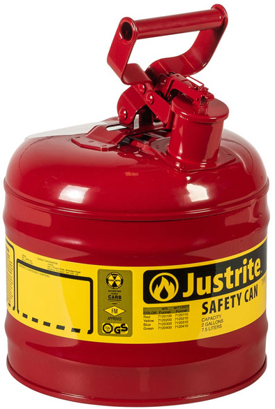 Made from high-grade coated steel, each can is tested to guarantee 100% leakproof construction. The tough powder-coat finish resists chemicals and stands up to demands of rigorous use. Each Justrite safety can is equipped with a stainless steel flame arrester which dissipates heat to stop flashback ignition. Cans up to 1 quart (1L) feature a trigger-release handle, while larger capacities have a swinging handle to greatly ease carrying of heavier loads.