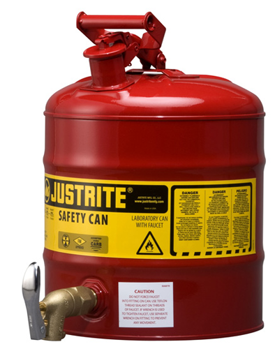 Justrite's Steel Laboratory Safety Cans have all the benefits of the Type I cans. Added features make these the choice of lab professionals for safely dispensing hazardous liquids into test tubes, small flasks and beakers. Fill spouts have self-close, pressure-relief caps and stainless steel flame arresters. These cans also feature a vacuum-relief valve within the lid for smooth liquid flow, and self-closing faucets for trouble-free dispensing. Cans with the smaller No. 08540 faucet offer easier dispensing in lab environments, while the No. 08902 faucet is better suited for heavy, industrial use.