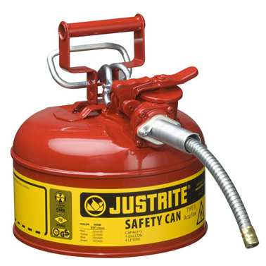 Experience the benefits of Justrite's Type II AccuFlow™ safety cans available in several colors and suitable for the storage of flammable liquids.This helps identify specific liquids, and avoids costly errors when using more than one liquid at a worksite.