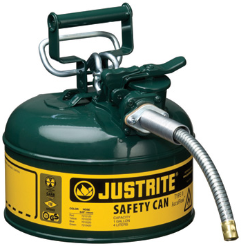 Experience the benefits of Justrite's Type II AccuFlow™ safety cans available in several colors and suitable for the storage of flammable liquids.This helps identify specific liquids, and avoids costly errors when using more than one liquid at a worksite.