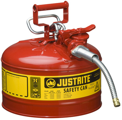 Experience the benefits of Justrite's Type II AccuFlow™ safety cans available in several colors and suitable for the storage of flammable liquids.This helps identify specific liquids, and avoids costly errors when using more than one liquid at a worksite.