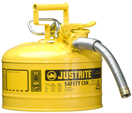 Experience the benefits of Justrite's Type II AccuFlow™ safety cans available in several colors and suitable for the storage of flammable liquids.This helps identify specific liquids, and avoids costly errors when using more than one liquid at a worksite.