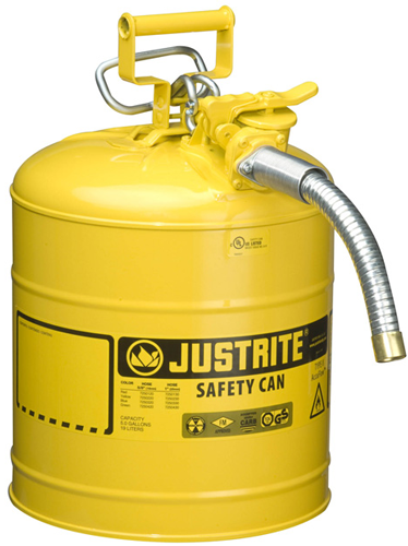 Experience the benefits of Justrite's Type II AccuFlow™ safety cans available in several colors and suitable for the storage of flammable liquids.This helps identify specific liquids, and avoids costly errors when using more than one liquid at a worksite.