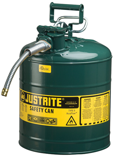 Experience the benefits of Justrite's Type II AccuFlow™ safety cans available in several colors and suitable for the storage of flammable liquids.This helps identify specific liquids, and avoids costly errors when using more than one liquid at a worksite.