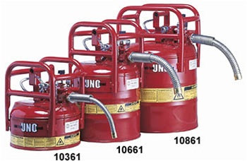 Justrite 7325120 Safety Cans help to make you compliant with the Department of Transportation's regulations for the transporting of flammables with their D.O.T. approved safety cans.  The one multi-task spout makes the change from transporting to using easy. A easy to use tightening screw works with a hold down bracket attached to the spout helps in preventing spillage and vapor release. Dual fusible link bracket is easy to engage and guards against content spillage and fume release as required by D.O.T. The fusible link melts at 165F to prevent dangerous pressure build-up at elevated temperatures. This link can be disengaged when can is not in transport to change the can into a normal safety can. When the can is not being transported, the hold-down bracket can be secured firmly to the top of the spout to prevent loss or damage. This can features a roll bar that helps to protects the spout, handle and trigger if a fall would occur.