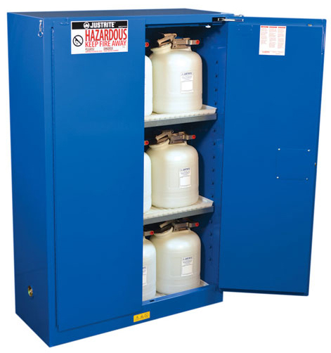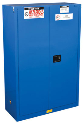 Justrite Hazardous Material Safety Cabinets have the same quality safety features as the cabinets for flammables. All models come with double-wall construction, dual vents, grounding wire connections, adjustable shelves, leakproof sills, three-point self-latching doors and leveling feet. Self-close door(s) shuts and latches automatically when a fusible link melts at 165°F (74ºC) under fire conditions. Unique, concealed self-closing mechanism offers obstruction-free access to contents. Additionally, they include polyethylene trays that sit on top of galvanized steel shelves and a separate polyethylene liner for the bottom sump to resist aggressive chemicals. Easily remove the liner for quick cleaning of drips and leaks. An all epoxy baked-on powder-coat finish, inside and out, provides increased chemical resistance.