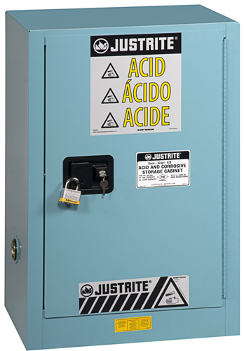 Justrite blue steel Piggyback safety cabinets for corrosives have the same quality safety features as the cabinets for flammables. All models come with double-wall construction, dual vents, grounding wire connections, adjustable shelves, leakproof sills, three-point self-latching doors and leveling feet. Self-close door(s) shuts and latches automatically when a fusible link melts at 165°F (74ºC) under fire conditions. Unique, concealed self-closing mechanism offers obstruction-free access to contents.