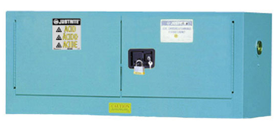 Justrite blue steel safety cabinets for corrosives have the same quality safety features as the cabinets for flammables. All models come with double-wall construction, dual vents, grounding wire connections, adjustable shelves, leakproof sills, three-point self-latching doors and leveling feet. Self-close door(s) shuts and latches automatically when a fusible link melts at 165°F (74ºC) under fire conditions. Unique, concealed self-closing mechanism offers obstruction-free access to contents.