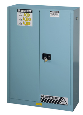 Justrite blue steel safety cabinets for corrosives have the same quality safety features as the cabinets for flammables. All models come with double-wall construction, dual vents, grounding wire connections, adjustable shelves, leakproof sills, three-point self-latching doors and leveling feet. Manual-close door(s) opens to a full 180 degrees and self-latches when pushed closed.