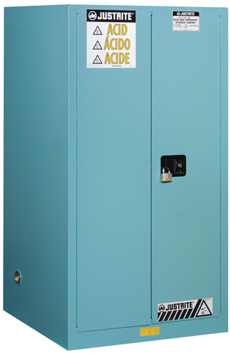 Justrite blue steel safety cabinets for corrosives have the same quality safety features as the cabinets for flammables. All models come with double-wall construction, dual vents, grounding wire connections, adjustable shelves, leakproof sills, three-point self-latching doors and leveling feet. Self-close door(s) shuts and latches automatically when a fusible link melts at 165°F (74ºC) under fire conditions. Unique, concealed self-closing mechanism offers obstruction-free access to contents.
