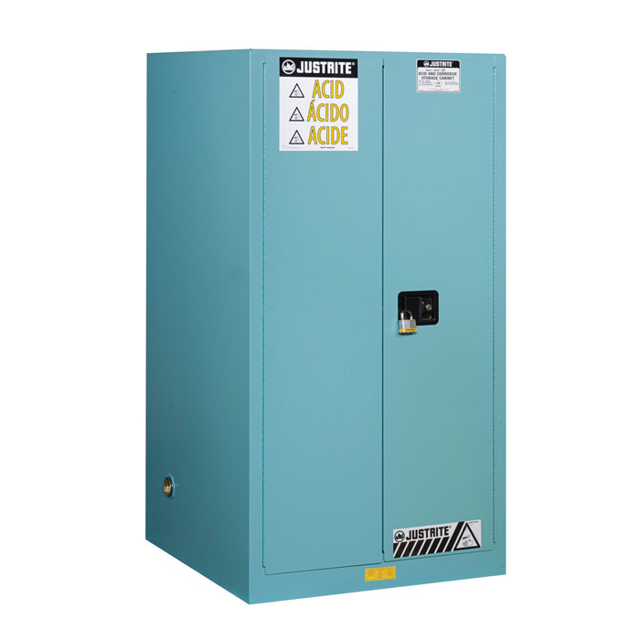 Justrite blue steel safety cabinets for corrosives have the same quality safety features as the cabinets for flammables. All models come with double-wall construction, dual vents, grounding wire connections, adjustable shelves, leakproof sills, three-point self-latching doors and leveling feet. Self-close door(s) shuts and latches automatically when a fusible link melts at 165°F (74ºC) under fire conditions. Unique, concealed self-closing mechanism offers obstruction-free access to contents.