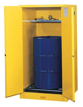 For storage of larger quantities of flammable solvents, the heavy-duty Drum Safety Cabinet is available in many styles and sizes. Built to the same high standards as the smaller Classic Safety Cabinets, a reinforced liquid-tight sump contains spills. An array of drum accessories and equipment is available to ensure safety and convenience when storing and handling drums of hazardous materials.