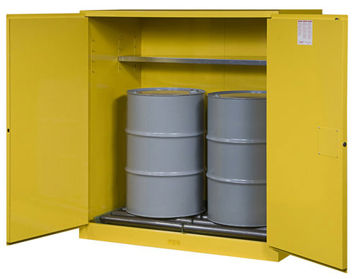 For storage of larger quantities of flammable solvents, the heavy-duty Drum Safety Cabinet is available in many styles and sizes. Built to the same high standards as the smaller Classic Safety Cabinets, a reinforced liquid-tight sump contains spills. An array of drum accessories and equipment is available to ensure safety and convenience when storing and handling drums of hazardous materials.