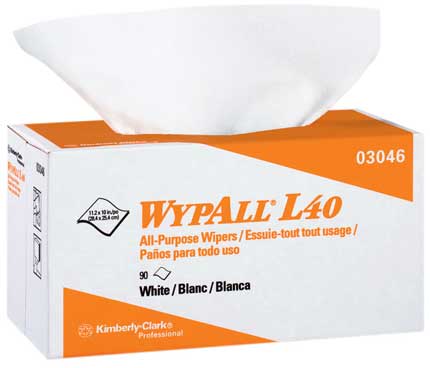 WYPALL* L40 Wipers in POP-UP* Box. Ideal for routine industrial cleaning and maintenance such as absorbing large liquid spills and leaks. Removes soils and liquids from face and hands. One-at-a-time dispensing for users on the go. Sheet Size: 10" x 9.8". White. 90 wipers/box, 9 boxes/ case