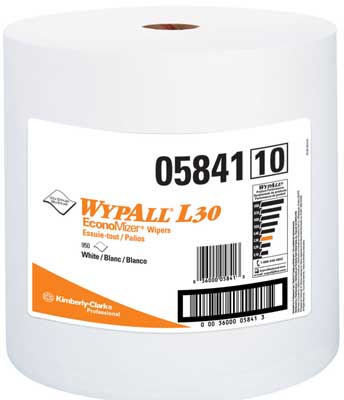 WYPALL* L30 Wipers in a Jumbo roll format. Ideal for general purpose, light duty cleanups. Removes soils and liquids from face and hands. One-at-a-time dispensing for users on the go. Sheet Size: 12.4" x 13.3". White. 1 Roll of 950 sheets.