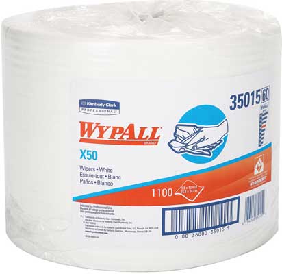 WYPALL* X50 Wipers in Jumbo Roll format. Our most economical extended use wiper picks up where the competition falls apart. WYPALL* X50 Wipers combine versatile performance with economical design for light-duty tasks. Ideal for manufacturing, healthcare and transportation environments. Great for Applying lubricants. Vehicle and equipment cleanup. Low lint glass cleaning and wiping Sold by the roll of 1100 wipers per roll. Wipers measure 9.8" X 13.4".