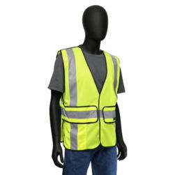 This High visibility green mesh safety vest with 2" silver reflective tape meets ANSI Class 2 standards to ensure workers are completely visible. The adjustable hook and loop flaps keep the vest secured around the wearer. Includes 5 break-away points to keep the worker safe if the vest gets caught.