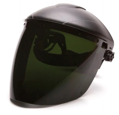 Pyramex IR5 Faceshields provide 99% UVA/B/C protection.  Feature universal slots to accommodate a wide variety of headgear, or can be used with the HGBR Pyraex Ridgeline Ratchet Headgear shown below.  When used together they offer secondary protection for welders and must be worn with spectacles or goggles.  Meets Z87+ standards.  Faceshields measure 8” x 15.5” and are .078” thick.  Faceshields and Headgear are sold separately.