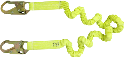 Fall arrest lanyard two snap hooks - one attaches to anchor point, and one attaches to harness D-ring.  Elastic webbing allows for maneuverability.