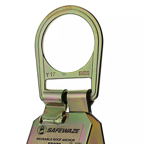 The Safewaze reusable Roof Anchor is forged with durable zinc steel and should be kept on had for temporary usage on wood or metal roofs.  Features an anchor hinge design that allows the roof anchor to be nailed or screwed into position on flat to sheer roofs.