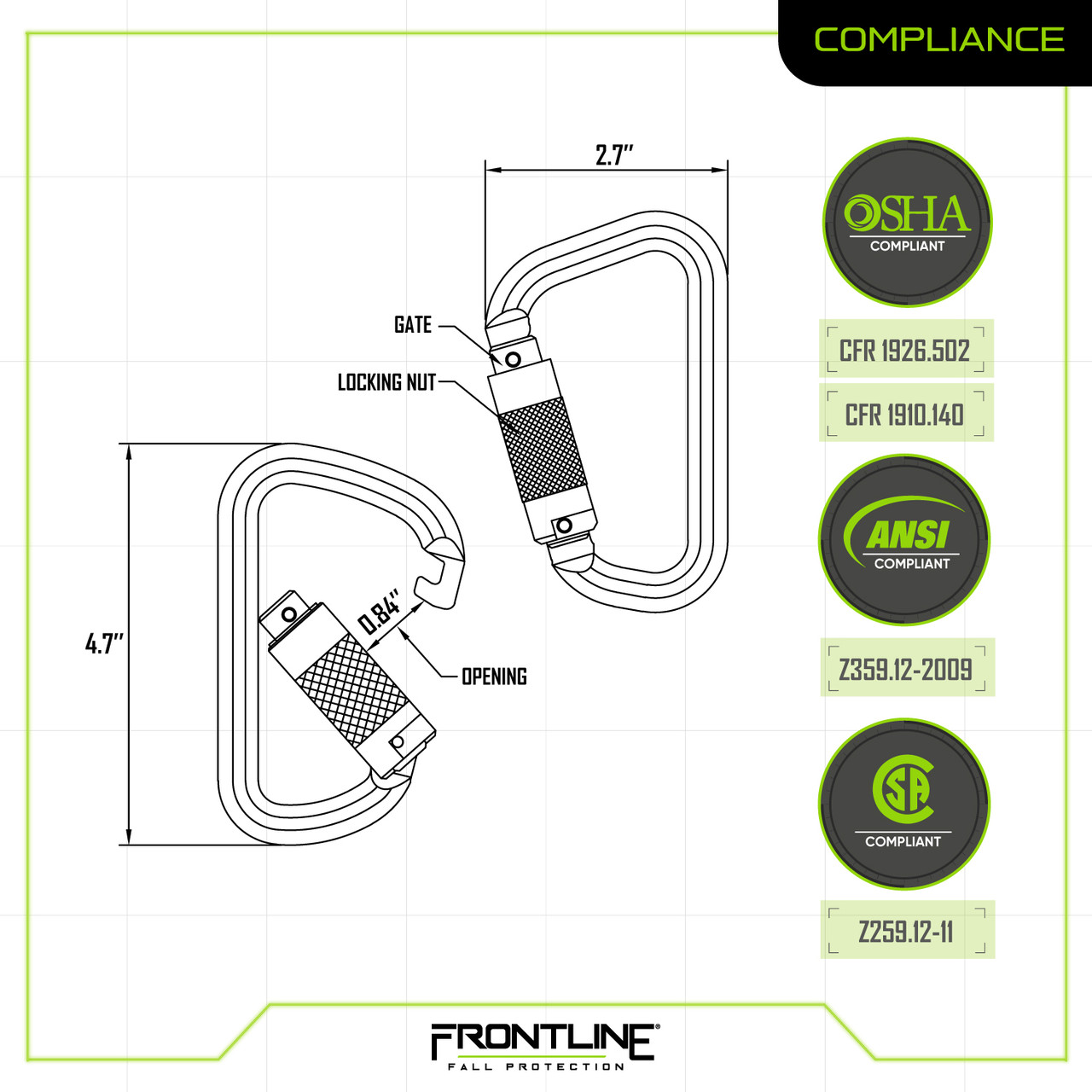 Frontline carabiners are engineered from premium-grade materials to endure extreme workplace environments! Frontline carabiners function as essential connection points between self-retracting lifelines (SRLs) or appropriate anchoring systems.