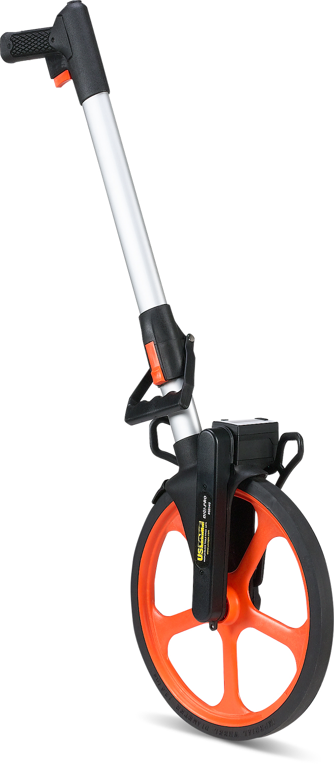 Ideal for long distances over rough surfaces! At the push of a button, the digital counter allows you to convert to different units of measure including feet, feet/inches, feet/tenths, meters, meters/centimeters, meters/decimeters, yards, and yards/inches. Features include a 12.5” diameter wheel, pistol grip trigger operated brake, measurement to 9,999 feet, balanced in-line design, heavy-duty chassis, debris scraper, belt-driven long-life counter, wide stance folding kick stand, sealed roller bearings, auto shut-off, and it folds for easy carrying. Requires 2 AA batteries (not included).